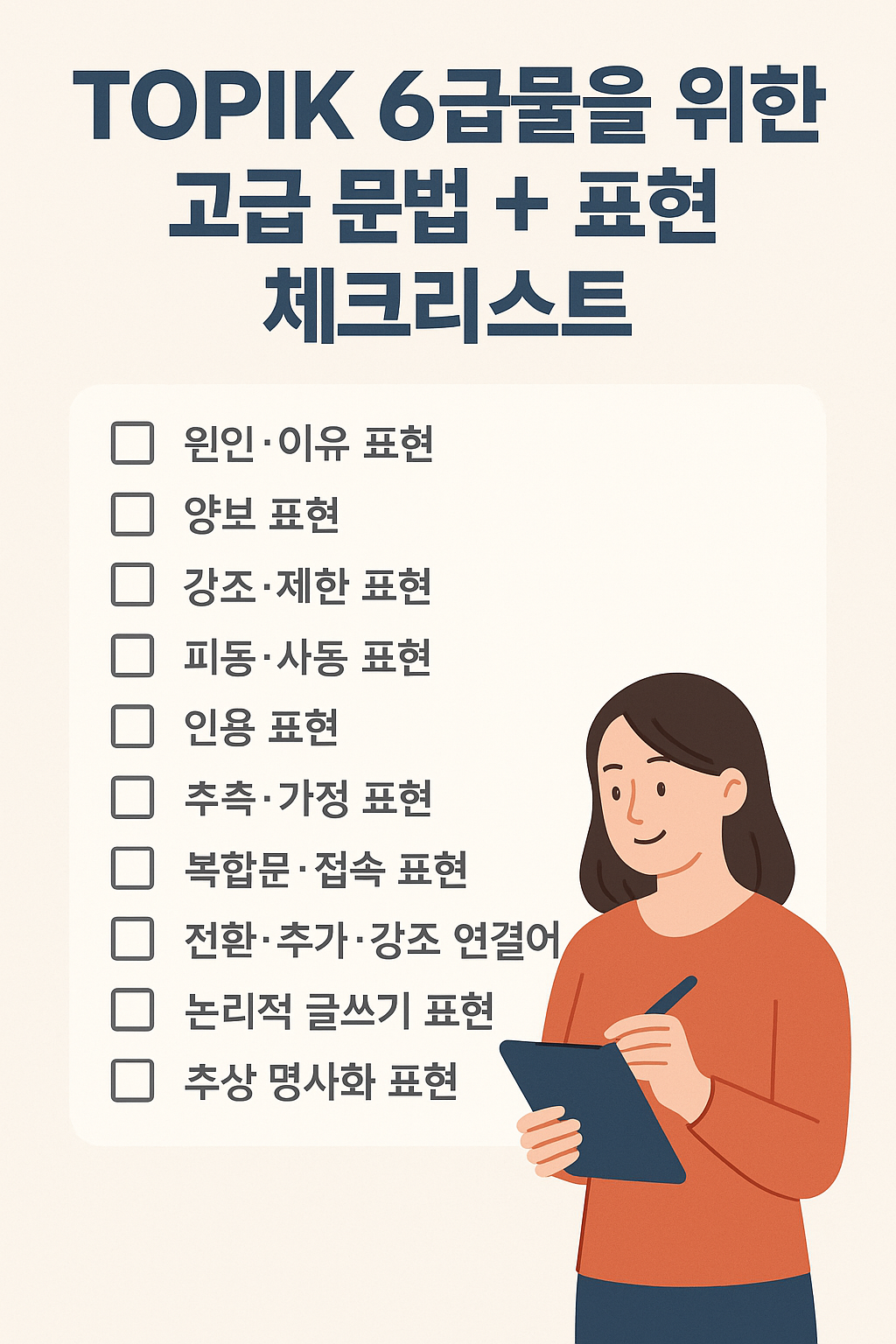 📘 TOPIK 6급을 위한 고급 문법 + 표현 체크리스트